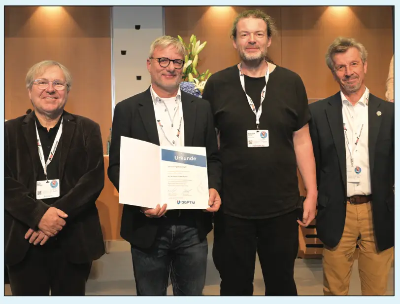 Von links: Gerd Haimerl (ebenfalls Ehrenmitglied der DGPTM), Dr. rer. medic. Frank Merkle, Sebastian Melzer und Dieter Lorenz (ebenfalls Ehrenmitglied der DGPTM)