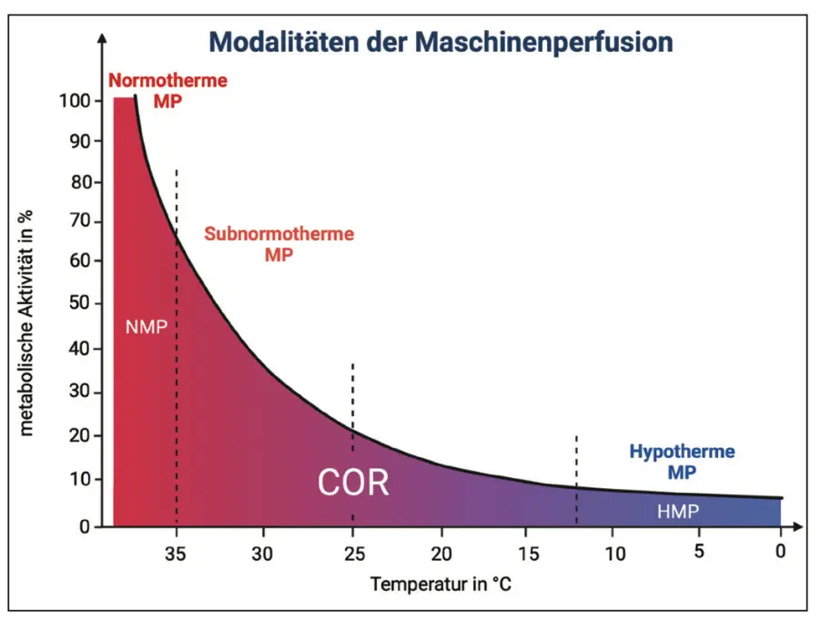 Die maschinelle Perfusion von Spenderorganen außerhalb des Körpers (Ex-vivo-Organperfusion) kann entweder kontinuierlich (upfront), von der Entnahme des Organs bis zu seiner Implantation, oder endischäm, ab Ankunft des Spenderorgans im Transplantationszentrum, durchgeführt werden. Zwei am häufigsten eingesetzten Perfusionstechniken sind hierbei die normotherme (NMP) und die hypotherme Maschinenperfusi- on (HMP) – siehe Abbildung 1 und 2.
