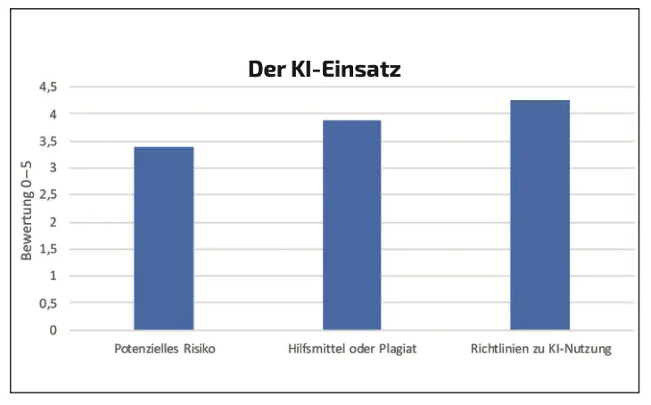 Die Bewertung der KI-Nutzung wurde auf einer Skala von 1 bis 5 bezüglich der Nützlichkeit von KI bewertet. Während die Aussage „KI unterstützt mich effektiv beim wissenschaftlichen Schreiben“ eine mittlere Zustimmung erhielt (M = 3,53), wurde der zeitsparende Aspekt deutlich positiver gesehen. Die Aussage „Die Nutzung von KI spart mir Zeit bei bestimmten Aufgaben“ erreichte eine hohe Zustimmung (M = 4,14), wobei 46,9 % der Nutzenden die volle Punktzahl vergaben.