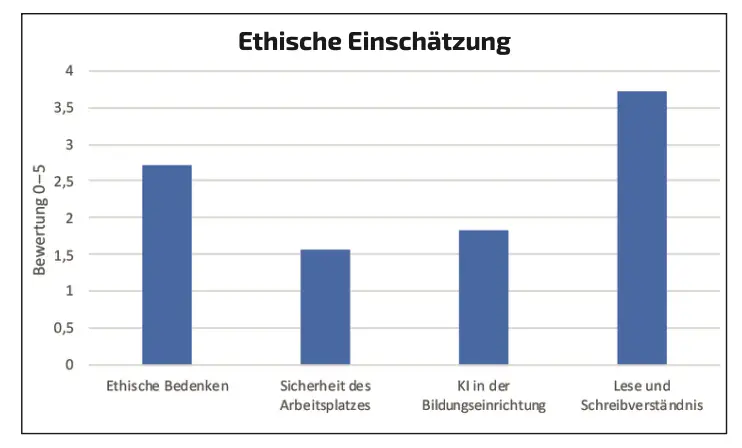 Ethische Bedenken wurden nur verhalten geäußert (M = 2,71). Die Angst, der eigene Arbeitsplatz könnte durch KI ersetzt werden, bekam die niedrigste Durchschnittsbewertung der Umfrage (M = 1,56). Sehr kritisch beurteilten die Teilnehmenden den Vorbereitungsstand der Bildungseinrichtungen, den sie als mangelhaft einschätzten (M= 1,82). Gleichzeitig bestand die Sorge, dass sich das allgemeine Lese- und Schreibverständnis durch die dauerhafte Nutzung von Chatbots verschlechtern könnte (M = 3,71) (Abb. 4).