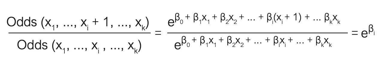 Die Größe eβi beschreibt demnach das Chancenverhältnis (Odds-Ratio) bei der Veränderung der Variable xi um eine Einheit. Da die anderen k–1 unabhängigen Variablen im Modell unverändert bleiben, spricht man auch von einer adjustierten Odds-Ratio, adjustiert auf die anderen k–1 unabhängigen Variablen. Der Koeffizient eβi wird auch als Einfluss- oder Effekt-Koeffizient bezeichnet. Erhält man einen Wert <1, so hat die Veränderung einen negativen Einfluss/Effekt auf die Odds-Ratio. Ein positiver Einfluss/ Effekt auf die Odds-Ratio liegt vor, falls eβi > 1 ist.