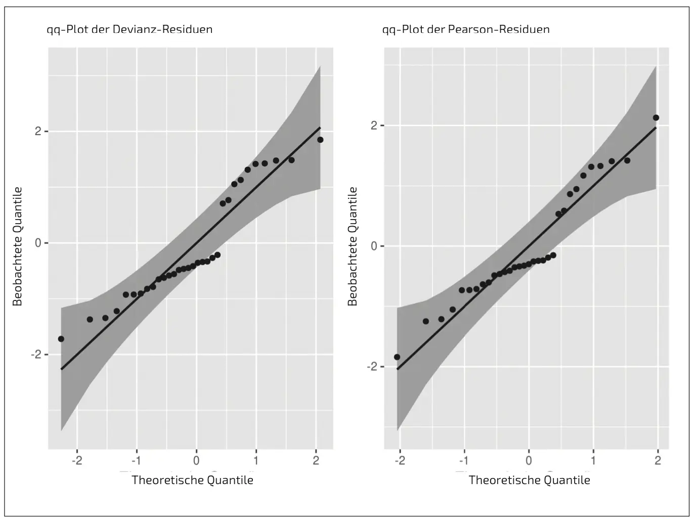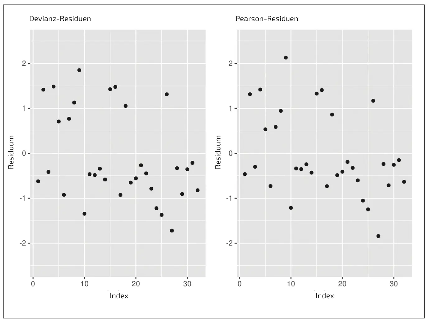Für die Modelldiagnostik verwendet man nicht die Residuen wie bei der linearen Regression [3], sondern die sogenannten Devianz- und Pearson-Residuen. Wir verzichten hier auf die Definition dieser Residuen und verweisen statt- dessen auf Abschnitt 8.4.5 in [2]. Falls das Modell korrekt ist, sollten diese Residuen zumindest näherungsweise einer Normalverteilung folgen (vgl. Abschnitt 8.4.5 in [2]).
