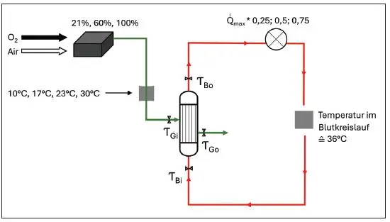 Aufgrund der unterschiedlichen Temperaturen der beiden Medien Gas und Blut besteht an der Membran eine Tendenz zum Temperaturangleich. Basierend auf dem zweiten Hauptsatz der Thermodynamik ist der erforderliche Wärmebetrag zum Temperaturangleich höher, je weiter die Temperaturen der beiden Medien auseinanderliegen, da Wärme in die Richtung des Temperaturgefälles strömt [13]. Hieraus kann geschlossen werden, dass der Leistungsfaktor des Gastauschers maßgeblich von dem Verhältnis zwischen der Gastemperatur am Oxygenator-Eingang und der Bluttemperatur abhängig ist.