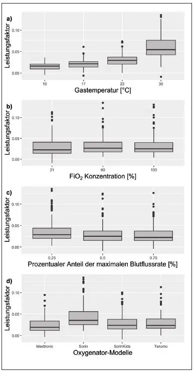In Abbildung 2 d wurde der Einfluss des Oxygenator-Modells erfasst. Berechnete Leistungsfaktoren der drei Modelle von Medtronic, Sorin Kids und Terumo weisen insgesamt ähnliche Werte von bis zu 0,113 (11,3 %) auf. Das Modell der Firma Sorin erzielt mit Leistungsfaktoren von bis zu 0,231 (23,1 %) Werte in einem höheren Bereich.